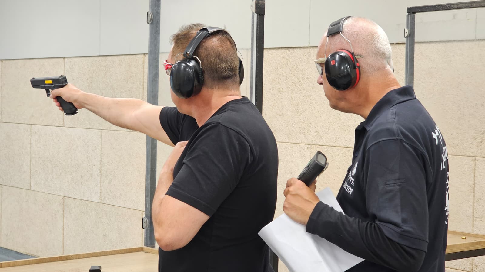 אחרי שתרגלנו גם החלפת מחסנית ביד אחת, עם נעיצת האקדח בשקע הברך בזמן רכינה (על דריכה ביד אחת דילגנו הפעם), עברנו לירי חם. רמי המדריך הקצה לנו שני כדורים בלבד לירי בשתי הידיים, רק ככה לטובת החימום ואת כל שאר 98 הכדורים ירינו ביד אחת כל פעם, ימין וגם שמאל. בתרגיל הראשון, כל יורה קיבל צמד מטרות, עם שתי מחסניות של 10 כדורים כל אחת. ואז כיוונו אל מרכז המסה, 10 כדורים ביד ימין ו-10 כדורים ביד שמאל.