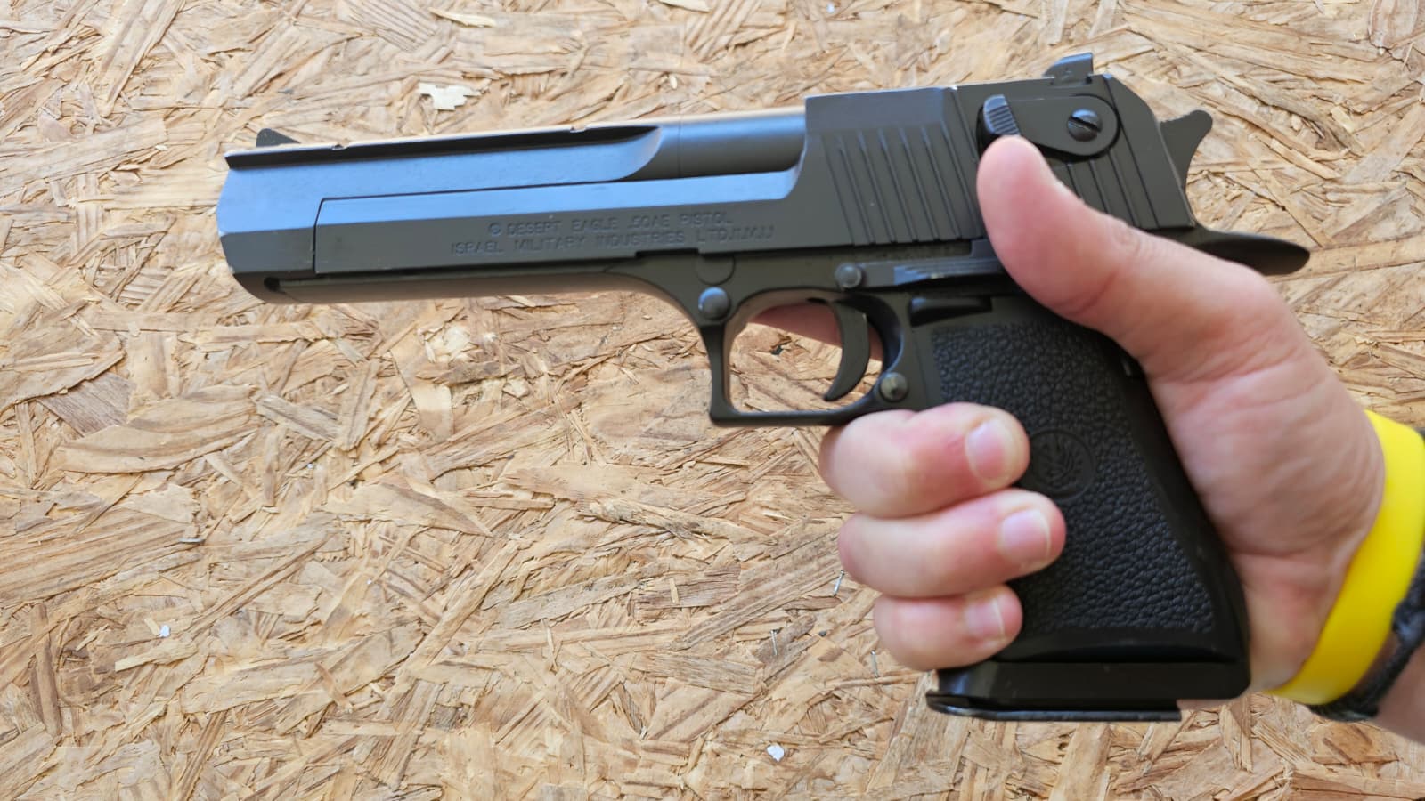 כאשר מרימים את האקדח מהשולחן, בהתחלה הוא מרגיש כבד, אחר כך הוא מרגיש ממש כבד ואז מבינים שזה בעצם לא אקדח, אלא רובה ששכחו לחבר לו קת. הוא פשוט עצום. ענק מעל לכל פרופורציה. קריקטורה. הארגונומיה שלו, באופן מפתיע, מקבלת טוויסט הגיוני – כלומר, ידית האחיזה מרגישה עבה מאוד והאצבעות נעלמות סביבה כאילו ניסיתי לאחוז גזע עץ, אבל אל תטעו. אתם לא אוחזים בדזרט איגל, אתם נאחזים בחיים, כי אם לא תאחזו בו בכל הכוח, תגלו מה יותר חזק – הכוונת הלהבית או הגולגולת שלכם.