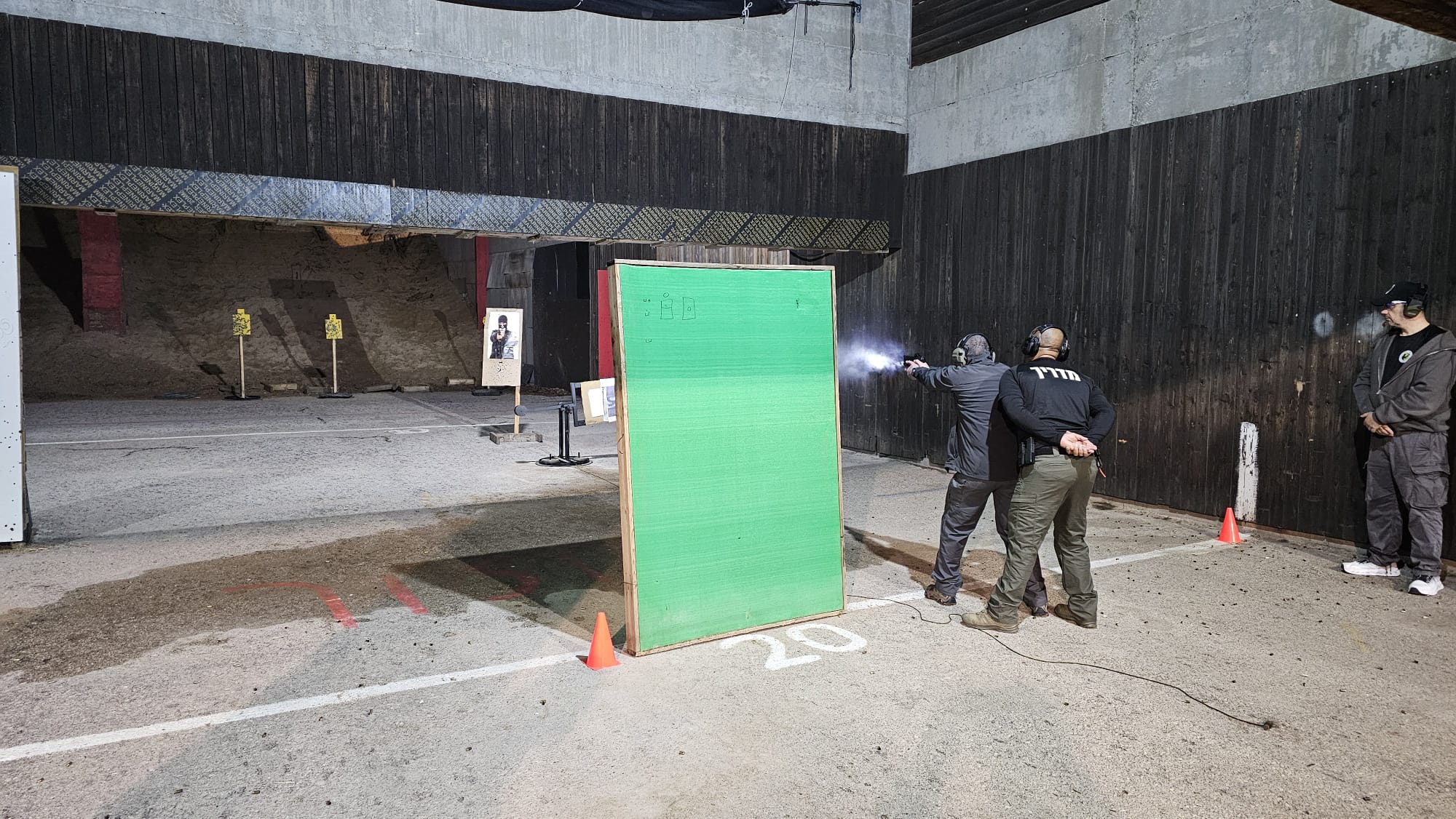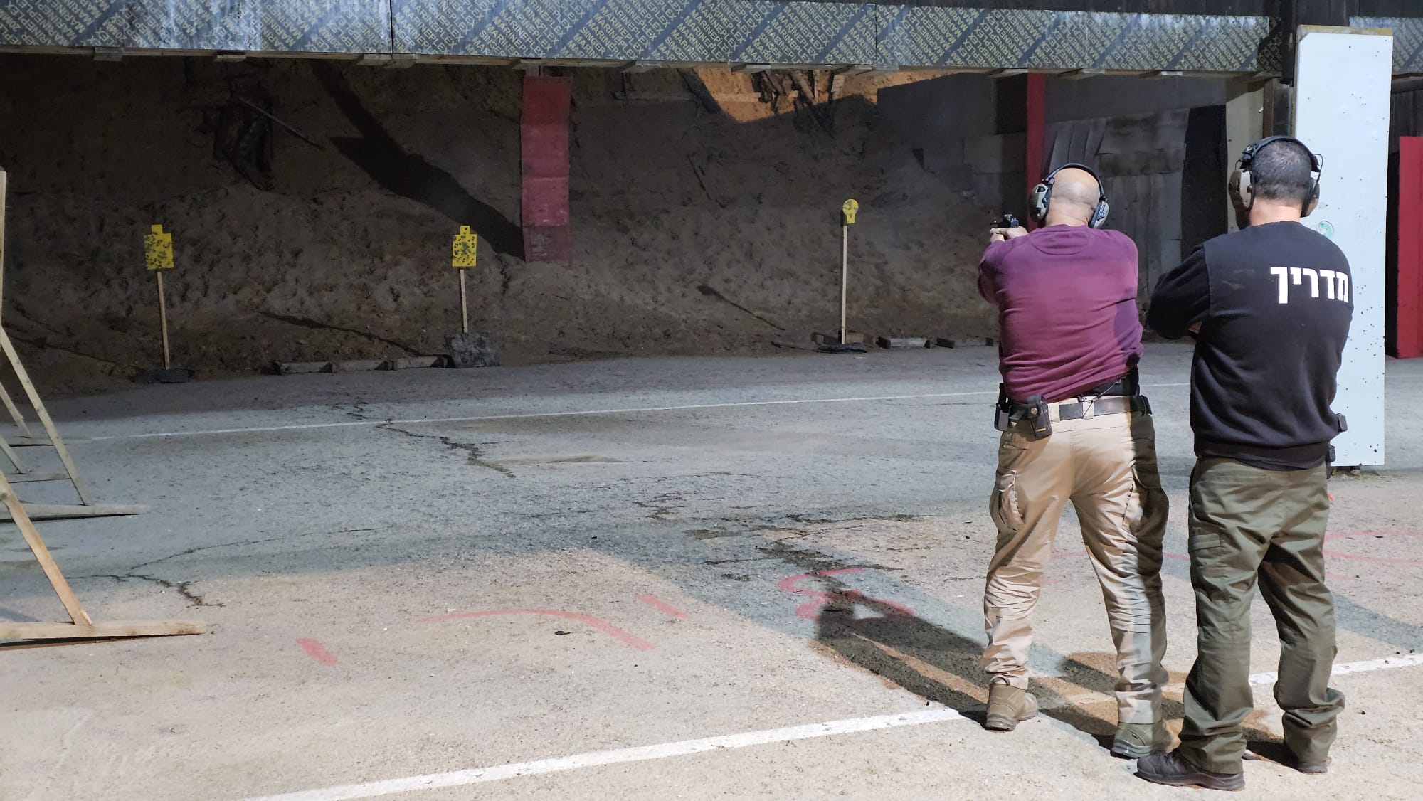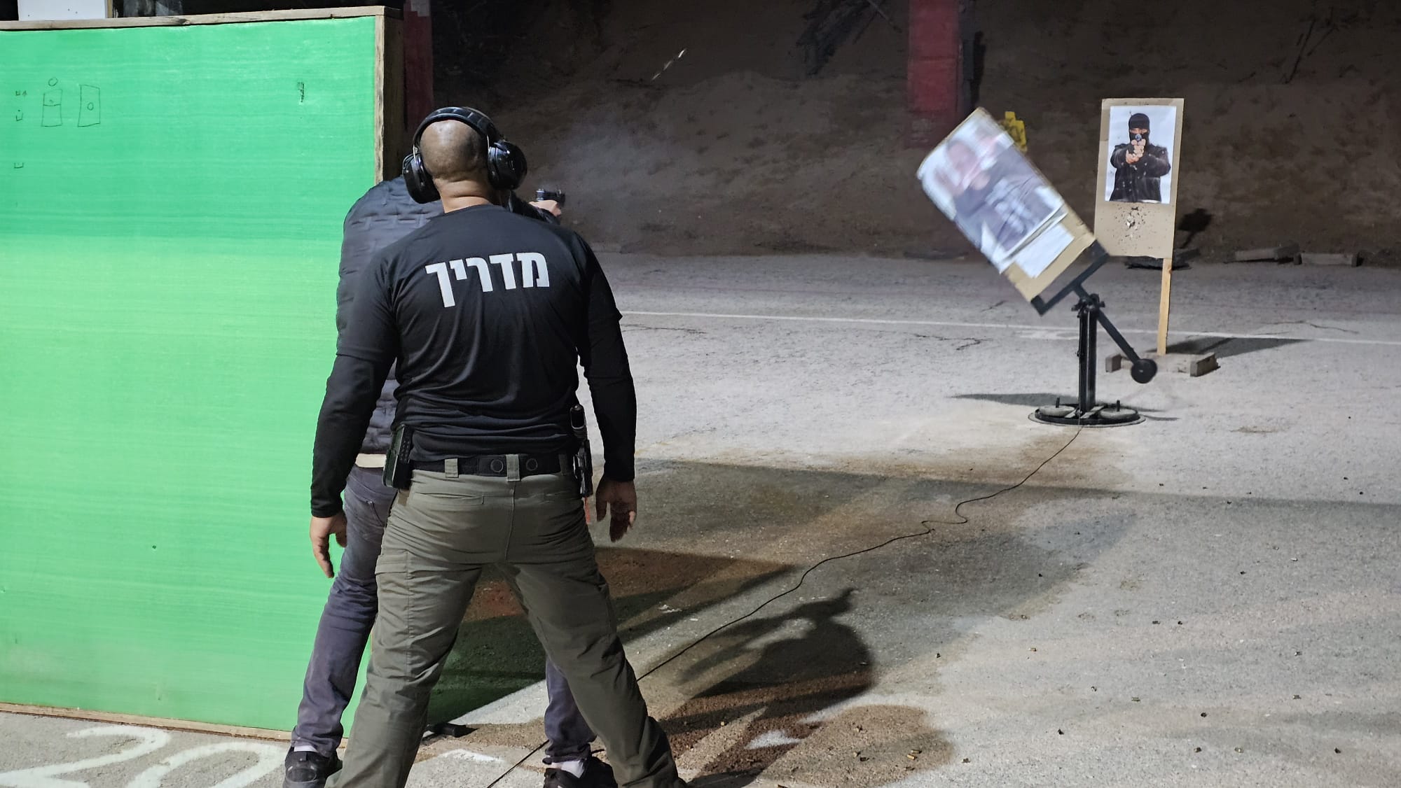 שטח הירי סודר בצורה פשוטה למדי. צמוד לחומת המפגע, רק 4 מטרות – שתי מטרות ברזל גוף משמאל ושתי מטרות ברזל ראש מימין. זהו. אין פירוטכניקה או הפקה מיוחדת. היורים התבקשו לעמוד אחד אחד עם מדריך מול מטרות הגוף ומתן הוראה, לשלוף, לדרוך, לירות שני כדורים אל מטרת גוף אחת ולבצע מעבר עם שני כדורים אל מטרת גוף שניה וחוזר חלילה עד גמר המחסנית, החלפתה בחדשה והמשך התרגיל. נשמע פשוט? כן, אבל את האתגר סיפק המרחק – 20 מטר.